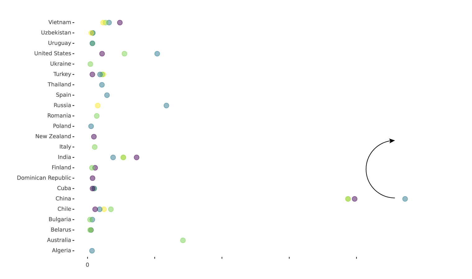 India, the United States and Russia are the second, third and fourth countries among the top 50 countries with the highest annual net forest conversion rate over the period.